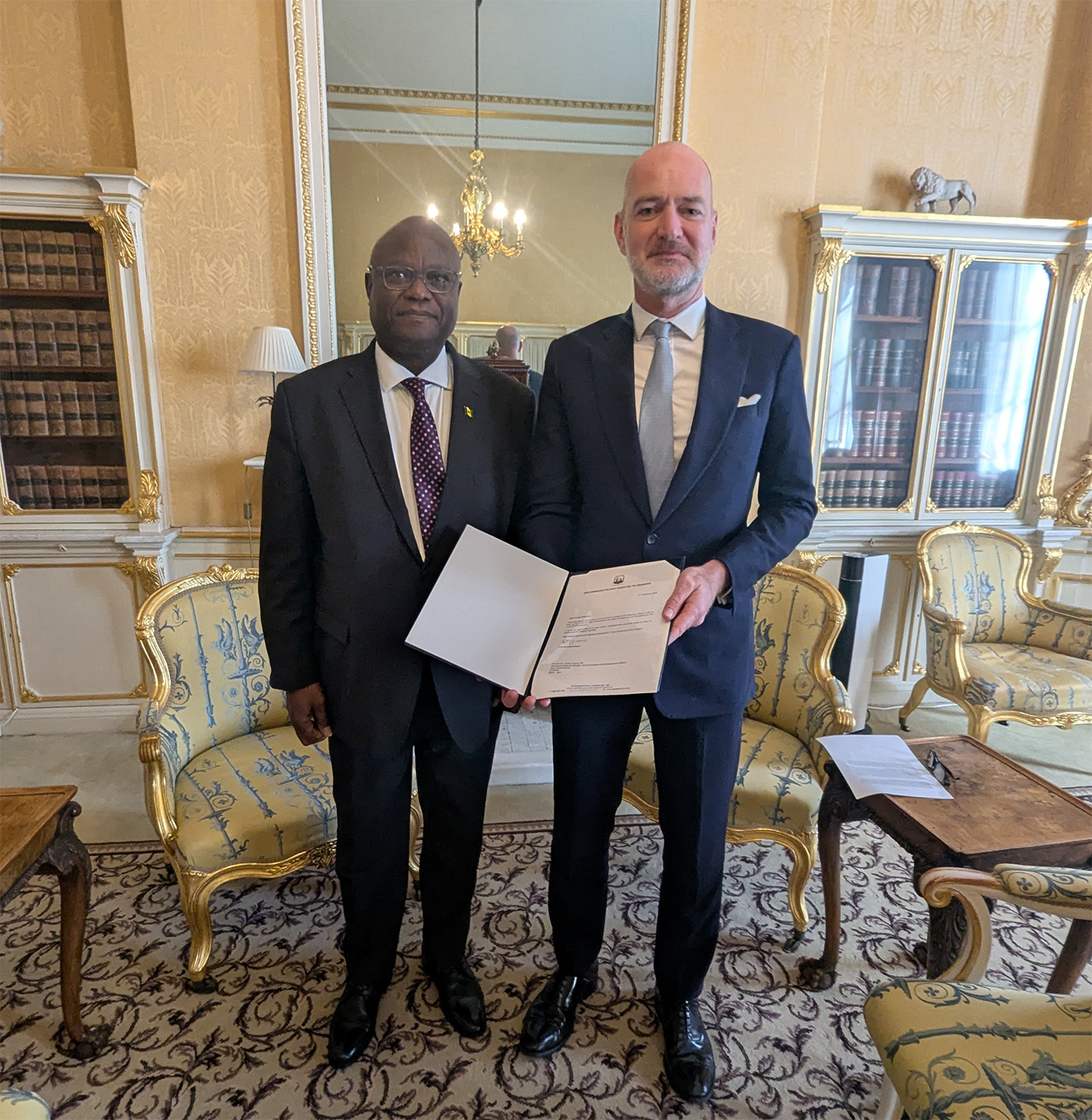 His Excellency JM Brereton Horne, High Commissioner of Saint Vincent and the Grenadines to the United Kingdom presented his credentials to Mr. Scott Furssedonn-Wood, Director of Protocol and Vice-Marshal of the Diplomatic Corps, at Lancaster House.